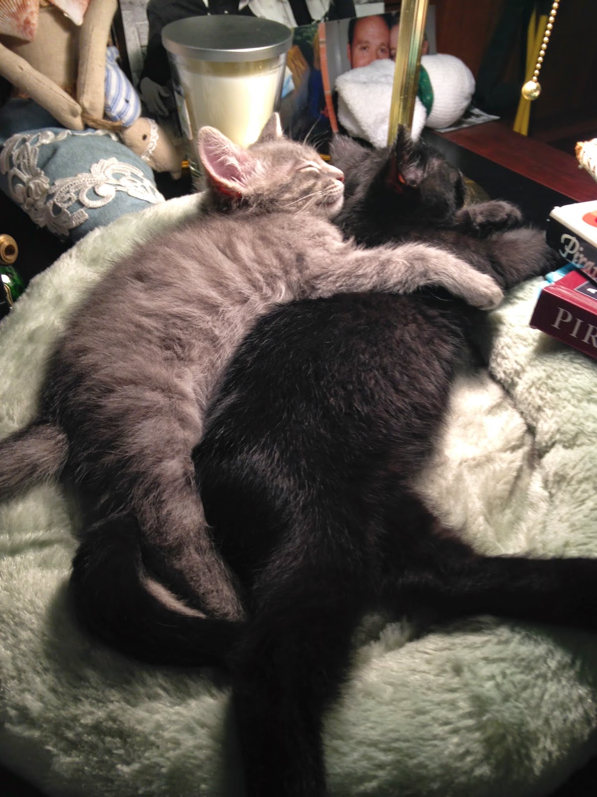 Also, many of you already know I've adopted two rescued kittens, who are into everything! They jump and run and wrestle and knock over stuff and eat my papers, and well just create havoc in general! But they are adorable and I love them. Here's one of their rare moments asleep. Right on my desk, in fact!